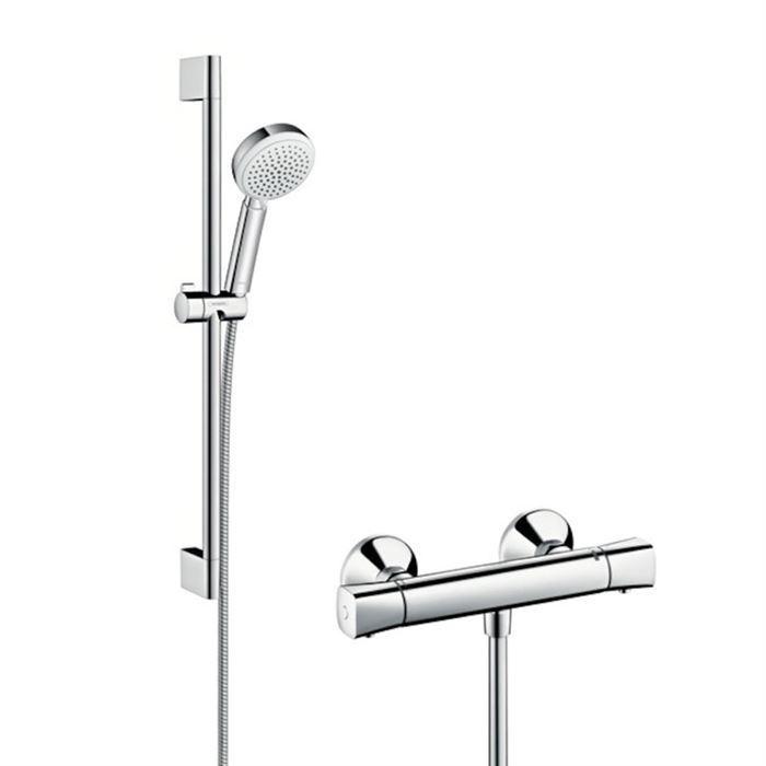 Dizajnový sprchový systém s termostatom Universal a sprchovou tyčou s dĺžkou 65 cm od známej spoločnosti Hansgrohe, je vďaka svojmu prevedeniu vhodnou voľbou do každej kúpeľne.
