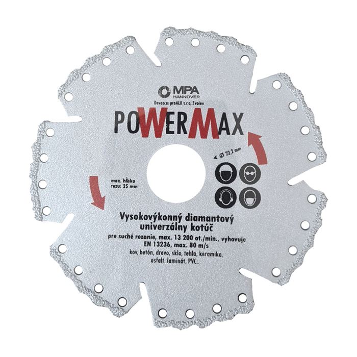 Diamantový univerzálny kotúč 125 mmPre suché rezanie:betón, železo, sklo, drevo, tehla, keramika, asfalt, laminát, PVC...Vnútorný priemer:22,2 mm, max: 10000 ot./min, max: 80 m/s