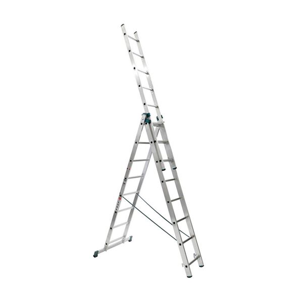 Trojdielny hliníkový univerzálny rebrík EUROSTYL, počet priečok 3 x 8, max. výsuvná dĺžka 5,13 m a šírka 454 mm.