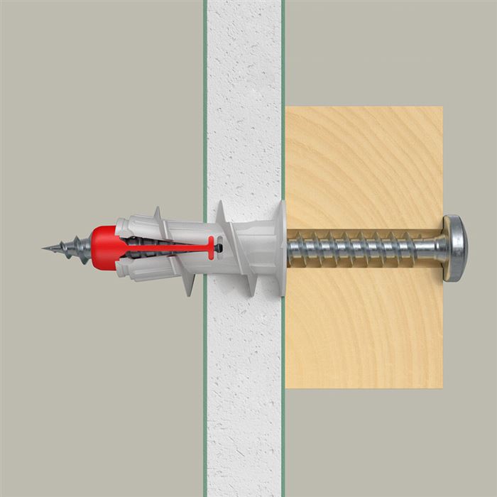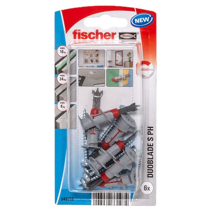 Hmoždinka fischer DuoBlade je najnovší prírastok do rodiny DuoLine. Pevná konštrukcia sa skladá z viacerých častí, vďaka ktorým má kotva vyšší výkon a funguje spoľahlivejšie. Samorezný kovový hrot odbúrava potrebu prevrtávania otvoru a čisto a presne pripraví cestu pre osadenie hmoždinky. Hmoždinka je určená pre predsadenú montáž pomocou skrutkovača, ale lepšie pomocou aku skrutkovača. Zavŕta sa do roviny s povrchom sadrokartónovej steny. Hmoždinka sa najlepšie používa so skrutkami do dreva alebo do plechu o priemere od 4 do 5 mm alebo tiež s závitovými okami, skobami a hákmi. fischer DuoBlade sa vynikajúco hodí na upevňovanie požiarnych hlásičov, garniží, záclonových tyčí alebo žalúzií, avšak pozor - nemali by ste vedome prekračovať garantovanú únosnosť.
