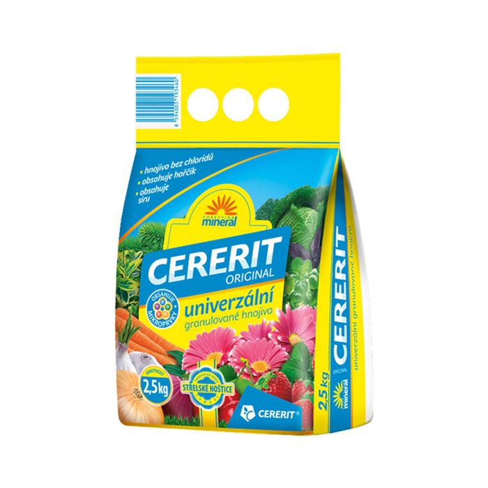 Cererit je bezchloridové granulované hnojivo so stopovými prvkami určené k výžive ovocia, zeleniny, chmeľu a okrasných rastlín.Zloženie:Minerálne NPK hnojivo 8% N + 13% P2O5+ 11% K2O + 2% MgO + mikroprvky.