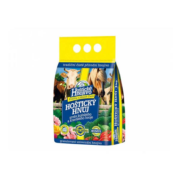 Zloženie:5% N + 2% P205 + 3% K20Popis:Hoštická hnoj sa hodí nielen pre univerzálne použitie v celej záhrade pre kvety a okrasné rastliny, ale obzvlášť pre zdravú výživu ovocia a zeleniny.Použitie:Aplikuje sa z jari alebo na jeseň rozhodením na povrch zeminy a potom sa vhodným náradím mierne zapraví do pôdy a dostatočne zavlaží. Neobsahuje klíčivé semená burín.Dávkovanie:Základné hnojenie pred výsadbou 1,3 - 2,5 kg na 10 m2, v skleníku 1,5 - 3 kg na 10 m2.Dávka na jeden 50 cm kvetináč s balkónovými rastlinami 150 - 200 g.Ruže a trvalky 1,3 - 2 kg na 10 m2.Zelenina a ovocie 250 - 300 g na 1 rastlinu, ihličnany a iné okrasné kríky 500 - 700 g na 1 rastlinu.Pre jesenné vyhnojenie odporúčame 2 kg na 10 m2.