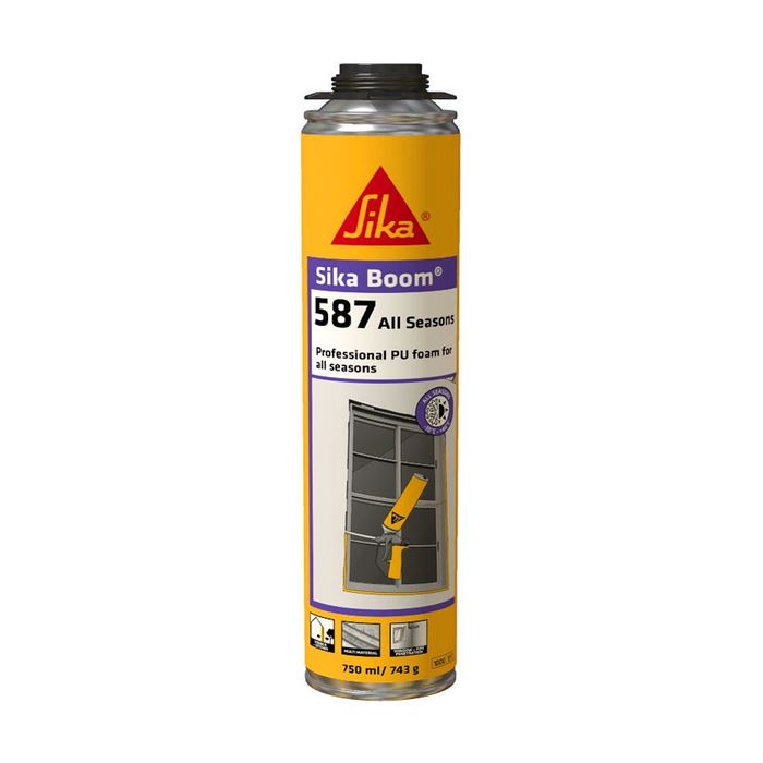 Sika Boom-587 All Seasons je polyuretánová, 1-komponentná, expanzívna pena na všetky sezóny. Špeciálne zloženie umožňuje jej použitie na chladných povrchoch a pri nízkej teplote vzduchu, pričom ostáva zachovaná štruktúra peny. Vytvrdenú penu je možné zarezať, brúsiť a natrieť. Vhodná na použitie v interiéri a exteriéri. Teplotný rozsah -10 °C až +35 °C.POUŽITIE: